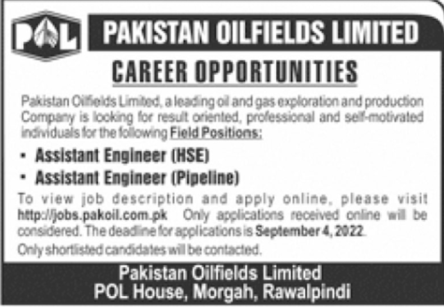 Pakistan Oilfield Limited POL has announced the latest jobs in Rawalpindi on August 29, 2022, in Dawn Newspaper. Applications are invited to fill the following Temporary posts in the POL, Rawalpindi. It requires the services of dynamic and self-motivated professionals for the following positions. Vacancies detail and their eligibility criteria are given below. The last date to get this job opportunity is
